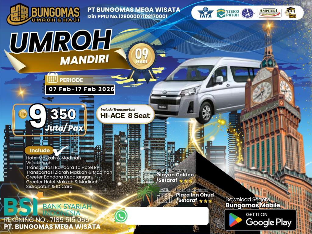 Konsep Umroh Mandiri Bungomas memberi Anda kebebasan seperti berangkat sendiri, tapi dengan jaminan keamanan dan kepastian seperti berangkat bersama rombongan resmi.