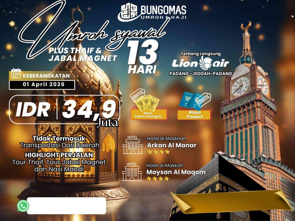 300326 Reguler 12D Padang 01 April 2026 / Syawal 1447 (Incl Pasport + Vaksin)